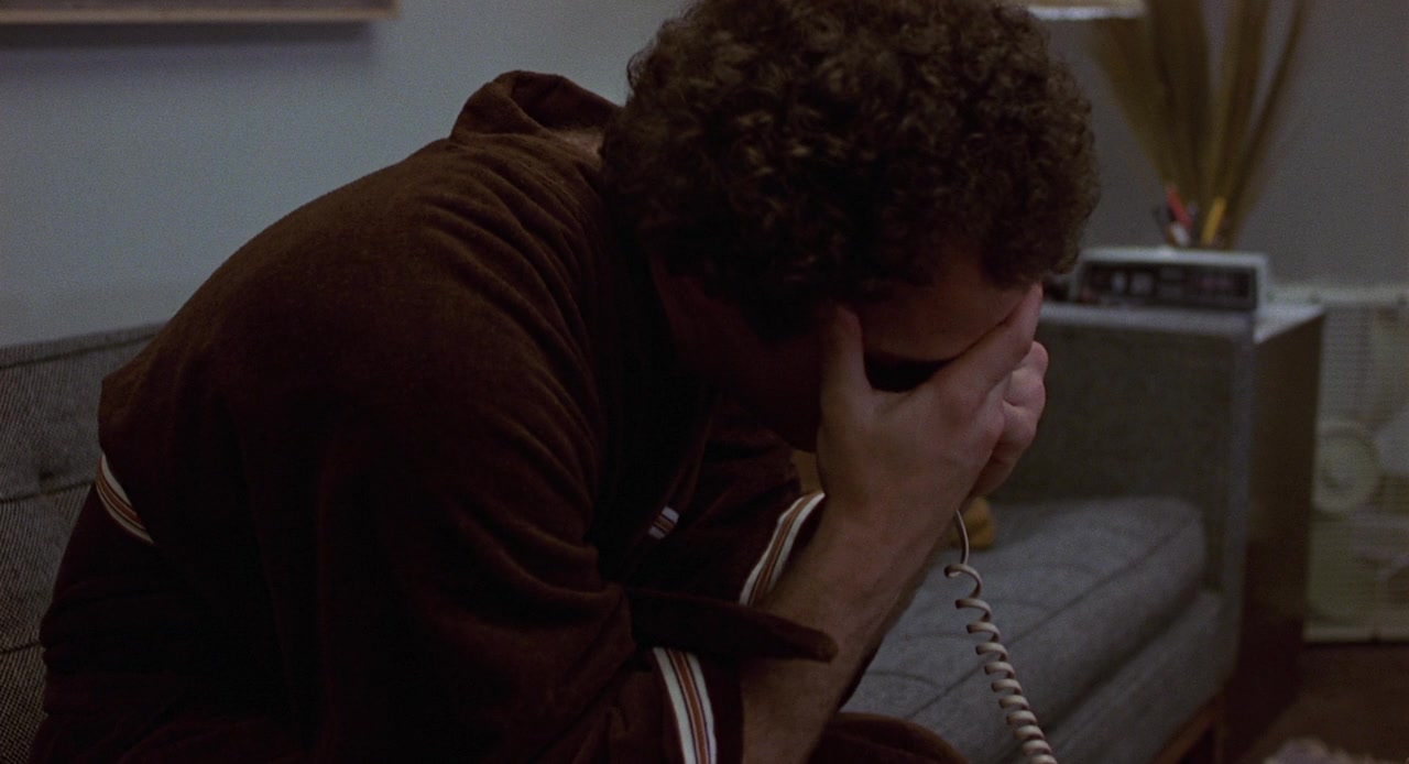 I wasn’t sure what to expect, and so was surprised to discover just how much of a high-wire act Brooks executes in Modern Romance, on which he is co-writer, director, and in basically every scene. In the first scene, his character Robert (a Hollywood film editor working on a clearly very silly science fiction movie) breaks up with his long-term girlfriend, Mary (Kathryn Harrold), then displays anxiety when she’s a little less broken up about it than he was hoping. He can’t work, he goes home, he takes quaaludes, he talks to his bird, he dances around to disco music, he talks to himself a lot, he calls a random woman from his rolodex, he tries to get in his car but is too high to drive. For a solid forty minutes, it’s just him kind of having a breakdown because of a break-up that he himself initiated. He keeps saying he’ll do one thing, then doing the exact opposite. He tries to go back to work, his assistant (Bruno Kirby) suggests he go home. He refuses, saying he will work to take his mind off of the break-up, but less than ten seconds later announces “I can’t do this! I have to go home!” Then when he gets home he calls the office and says he’d like to like come back in. He tries to call Mary, she picks up, then he hangs up, saying to himself that “it’s fate” that he didn’t actually talk to her.