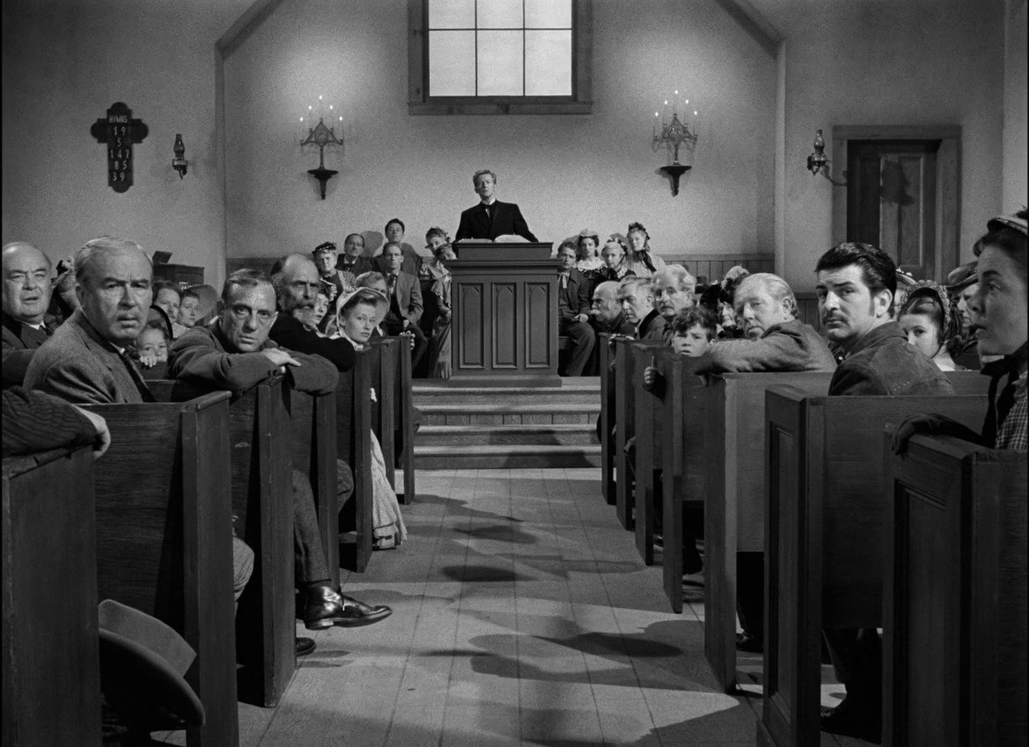 Kane travels all around town in that time and finds that all those friends and admirers he had, including the Mayor (Thomas Mitchell), the Judge (Otto Kruger), and his bitter former deputy (Lloyd Bridges), are not willing to help him. Some are too self-interested (Kane is too honorable to cut any deals to get the help he needs). Some are too cowardly. Some think they’re doing the smart thing. They’ll play it cool until it all blows over. There’s a church meeting (directly parodied in Blazing Saddles) where the town debates whether to help him and eventually decides against it to save their own skins. Even Amy begs Kane to leave rather than shed blood. But he never wavers or really considers doing anything else.
