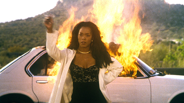 One of the more memorable aspects of the movie is the way all four of the women elucidate their own inner monologues in voiceover, often at odds with their exterior actions when it comes to men. We watch Robin trying to seduce a co-worker in sexy red lingerie, while on the inside she both acknowledges he’s not in her league and rationalizes her own actions. Later we hear Savannah in a very similar situation, noting that she finds the guy she’s waiting in bed for annoying, but “my body needs this, and it can’t hurt to get my feet wet. Well, not just my feet…” The other most memorable bits all involve Bassett, who has by far the showiest of the four roles. She gets to go big in some screamy arguments with her ex, destroys his possessions, and dramatically sets his car on fire then walks away while calmly lighting a cigarette. A put-upon firefighter then shows up to tell her that in Arizona, you’re not allowed to burn anything in your yard except for trash. “It is trash,” she spits in reply.