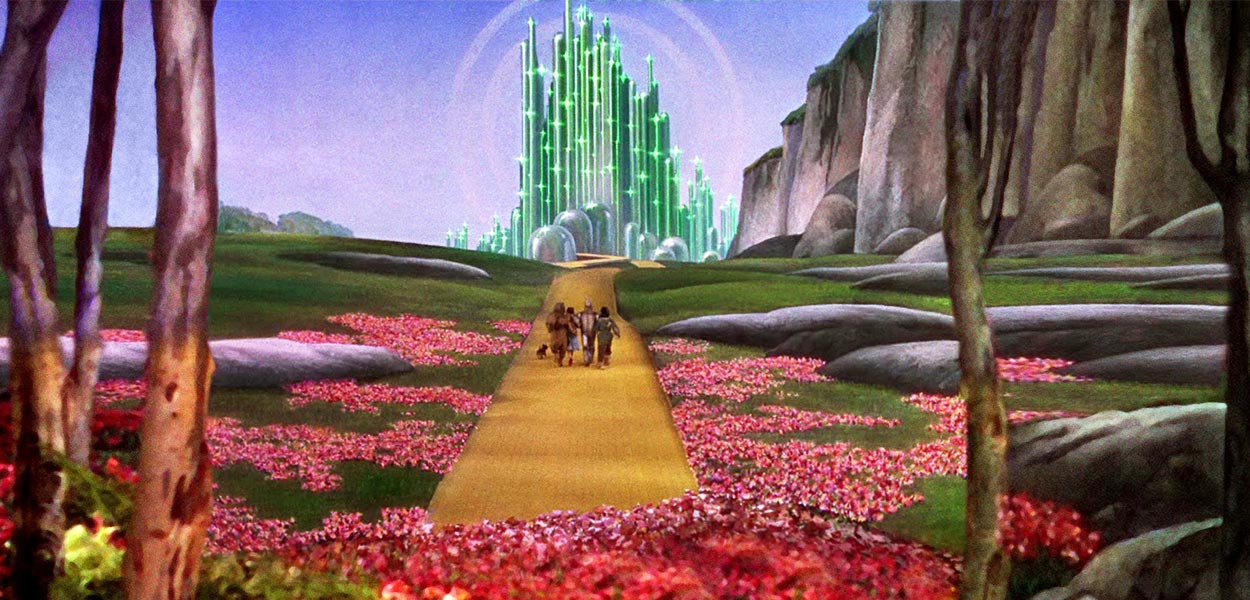 The impression of the incredibly bright colors is heightened by the way the movie gets to them. The opening sequence in Kansas is shot all in sepia tones (not black and white, though it was often shown this way later), but when Dorothy’s house is deposited in Oz, she opens the door to find a beautiful, color fantasy world. The camera trick to do this scene using any kind of “special effects” didn’t exist, so the effect was achieved, as so much else in this movie, using elaborate, practical means. The interior of the house was painted all in sepia tones, and stand-in for Judy Garland opened the door while wearing a sepia dress, then Garland walked out into the color set wearing her blue gingham dress.