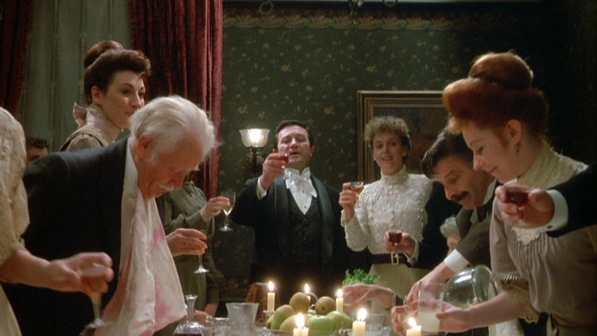 From the title, many might assume that The Dead is a horror story, but it really isn’t (James Joyce could not have known when writing this story in 1914 that his title would one day be un-googleable). Most of the movie centers around an Epiphany party thrown at a Dublin townhouse in 1904, hosted by two elderly sisters (Cathleen Delany and Helena Carroll) and their niece (Rachael Dowling). The “main characters,” as far as it goes, are two of the guests, Gabriel (Donal McCann) and Gretta Conroy (Anjelica Huston). Most of the movie is just showing us what happens at the party, none of which is super-earth shattering. It is all very told very simply, and apparently in real time. Huston does not attempt the floaty, tracking camera-work employed, for example, by Robert Altman in another period movie centering around a big party, Gosford Park. His spaces are more claustrophobic. Interactions are awkward, but cannot be escaped. At supper, all the characters crowd around the table. There is never quite enough room.