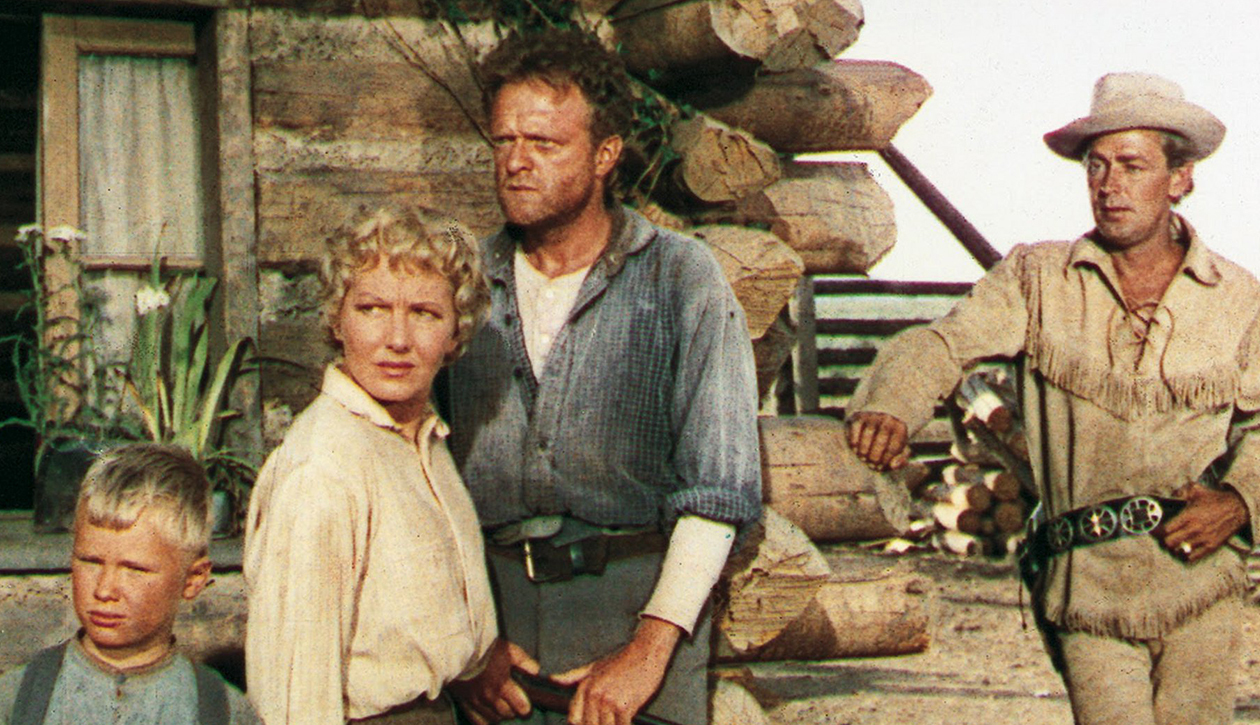 The plot of the movie is (very) loosely based on the actual historical incident of the Johnson County War, a conflict between different types of landowners in late-1800s frontier Wyoming that has also served as the inspiration for several other movies. These include The Virginian, Heaven’s Gate, and Clint Eastwood’s own Pale Rider. It opens with the mysterious Shane riding onto the homestead of Joe Starrett (Van Heflin), his wife Marian (Jean Arthur), and their young son Joey (Brandon deWilde). Shane is about to leave when local tough guy rancher Ryker (Emile Meyer) shows up to vaguely intimidate them into leaving, and after he backs up Starrett he is invited to stay and work on the farm. Joey is entirely star-struck, believing that Shane can do no wrong. When Shane lets the rancher’s son (Ben Johnson) throw a drink on him without fighting back, the kid is heartbroken, because I guess starting a big local war would have been “braver?”
