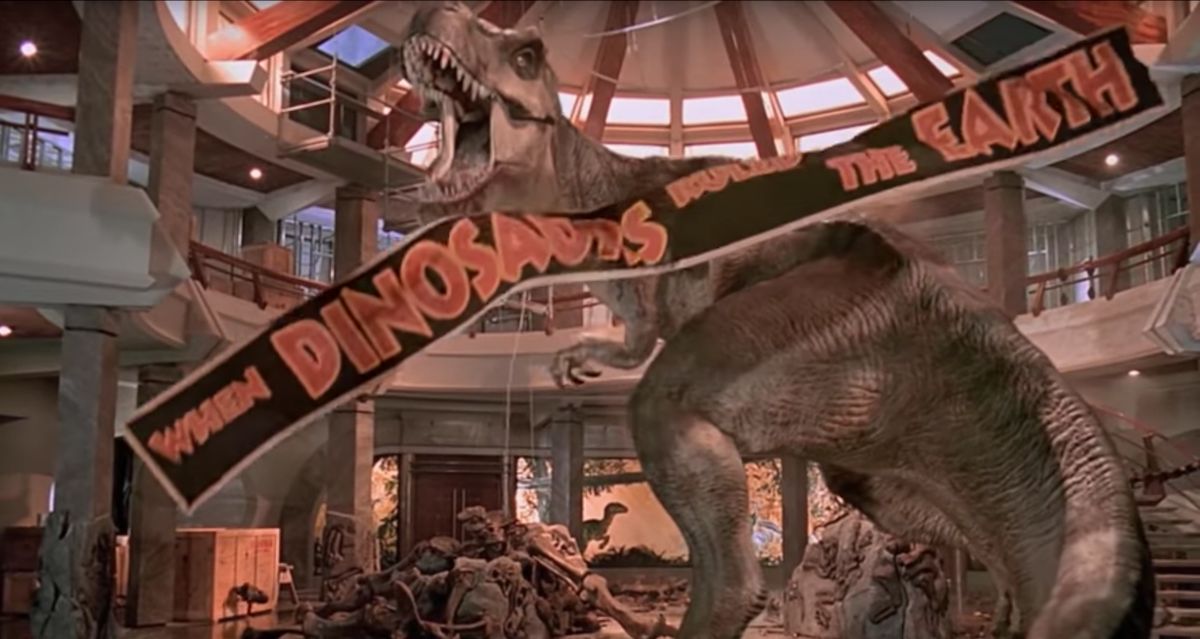I have not mentioned Samuel L. Jackson’s cigarette chomping computer technician, who gets the much-quoted line “Hold on to your butts!” or the great scene of Brachiosaurus heads appearing above the treetops and singing to each other like whales. Jurassic Park, for all of its quirks, really is a great movie. I would submit that some of the individual plotlines fall a little flat (the kids seem to mostly be in the movie to be put in peril, and annoy the hell out of me in every scene that they’re in), but I am more than willing to forgive that kind of thing if you put awesome dinosaurs in your movie. All of the adult performances are uniformly great (in addition to Goldblum, I think that Dern is doing some particularly great work here), and Spielberg pulls off some really great thriller/action sequences. The hurricane sequences work so well partly because they are not special effects, there was in fact a hurricane in the middle of production that many of the scenes were shot during. Jackson’s character’s death at the hands of Velociraptors takes place off screen (leading to a genuinely scary scene where Dern unexpectedly finds his severed arm), but in fact an elaborate set had been built for a chase sequence and his eventual death scene that was destroyed by the hurricane, so the production improvised.