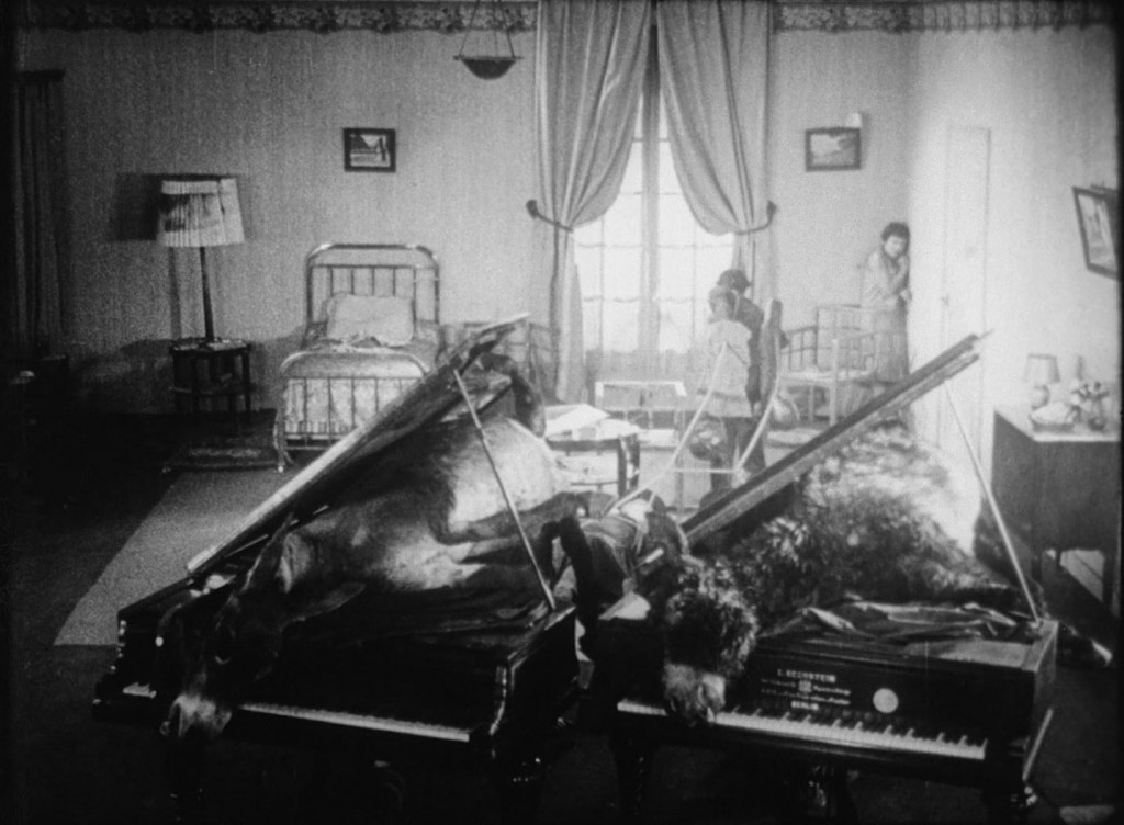 Other famous images are the hand infested with ants, the man suddenly pulling on two grand pianos covered with priests (played by Buñuel and Dalí) and dead donkeys (even more random than that sounds in context), and the final shot, where a woman and man traipse off happily onto a beach, followed by a title card reading “the Next Spring,” when we see them half-buried in sand, apparently dead. The title cards add to the disorientation, as they are all over the place and seem to have no relation to what’s going on. I halfway expected them to be read by the narrator from Spongebob Squarepants. One reads “Eight Years Later,” but in the interim we’re still in the same scene and no time seems to have passed.