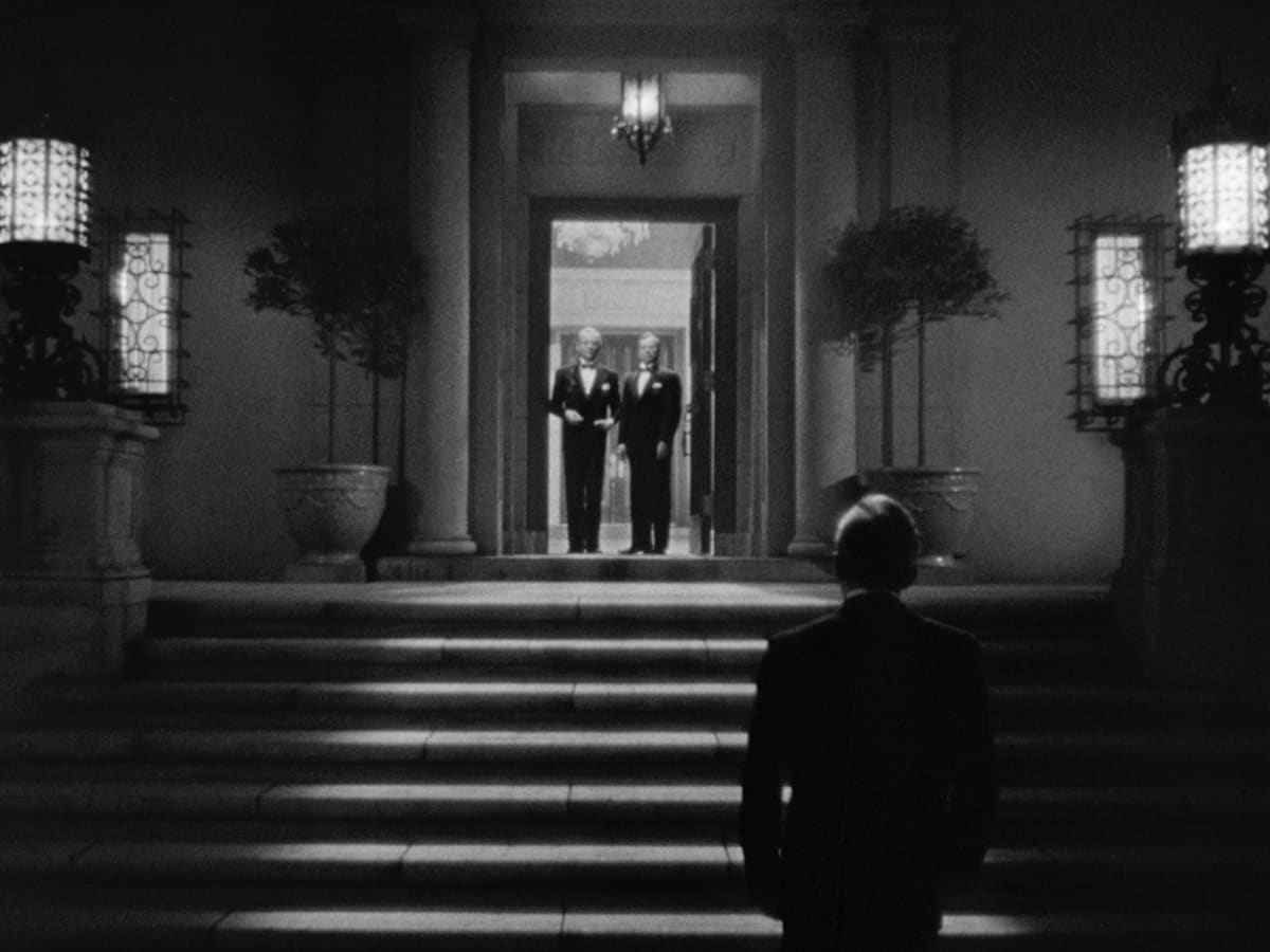 The front stairway of Rains’ home, repeatedly the scene of important moments in the movie, also illustrates how as a director Hitchcock takes every opportunity to push the viewer’s buttons. We watch character walk up and down the stairs all through the movie, and then the final, climactic moments have Bergman and Grant descending slowly, wanting to flee but knowing that if they don’t proceed deliberately it will give the game away. Count how many stairs there are in other scenes in the movie, and count how many we see Grant and Bergman descend in this scene. There are way more stairs at the end, because Hitchcock is stringing along the tension as long as he can.