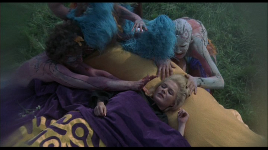 I considered featuring one of Stockwell’s several more critically-acclaimed movie roles, but in the end settled on The Dunwich Horror, mostly because I felt like watching it. Stockwell appears as the villain Wilbur Whateley, in one his first performances after leaving the commune. The movie is an on-the-cheap adaptation of an H.P. Lovecraft novella, yet is very much of its time and place. It is produced by the schlock king Roger Corman, who moved into Lovecraft after having success adapting many of the horror stories of Edgar Allen Poe. Sandra Dee, making a futile attempt to reinvent herself after her engenue roles dried up, plays Nancy, a coed at Arkham College who finds herself drawn in by the very weird Wilbur, and ends up drugged and on a slab, apparently ready to be sacrificed to let the Old Ones back into the world.