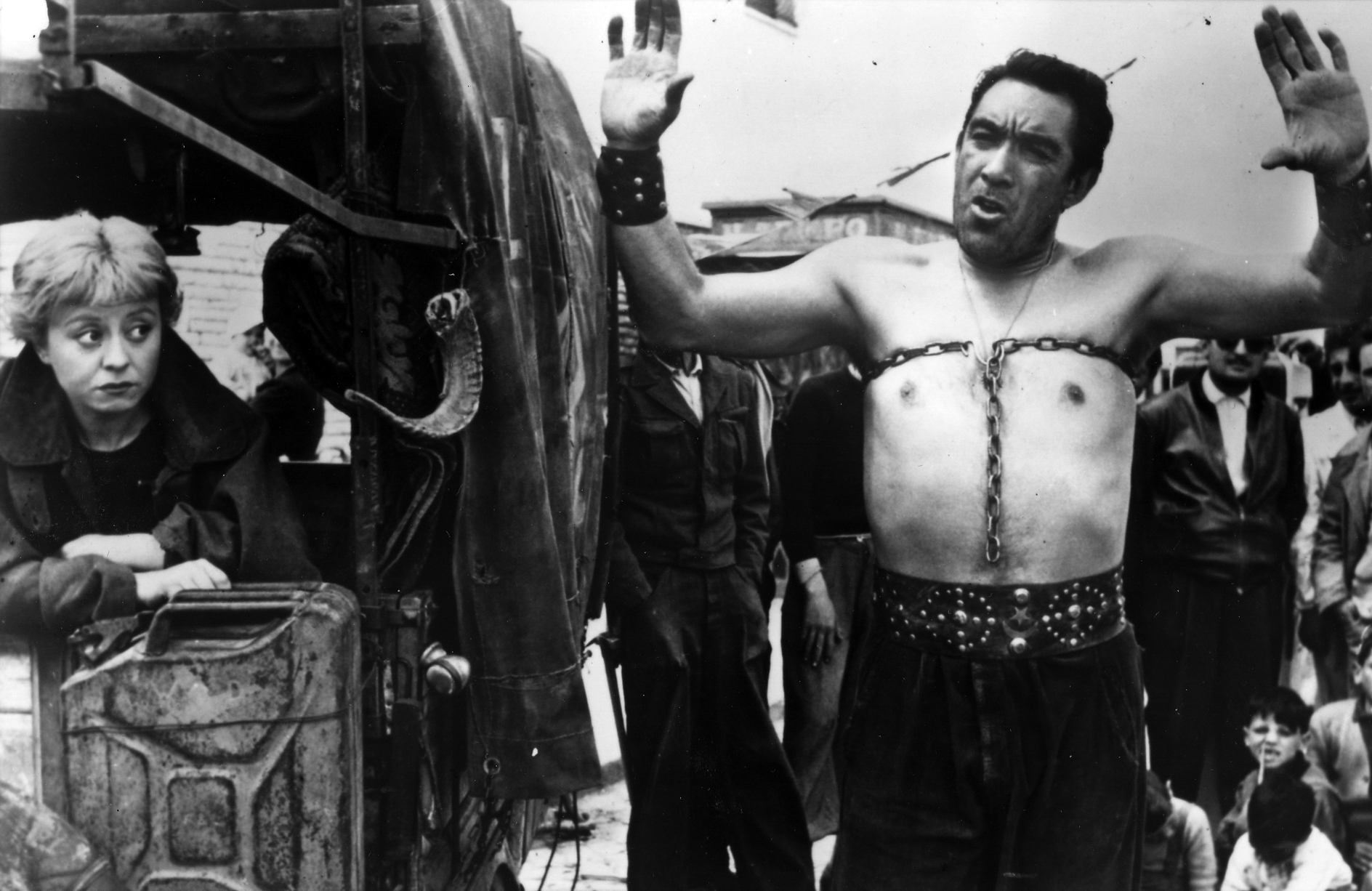 At one point he leaves her behind, at another point she runs off, but they always end up back together. Eventually they take a more permanent job at a traveling circus, where Gelsomina starts spending time with another performer, the Fool (Richard Basehart), to Zampano’s extreme displeasure. They are all fired from the circus after Zampano goes after the Fool with a knife. Later, they come upon the Fool changing his tire at the side of an empty road, and he and Zampano start fighting again. The Fool just can’t bring himself to stop making fun of Zampano, even with his life in danger, and Zampano does in fact beat him to death.